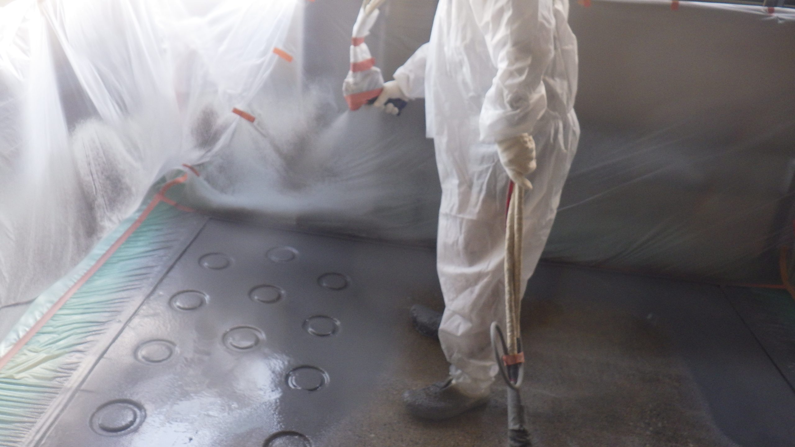 既存の状態から研磨・クラック補修・超速硬化ウレタンスプレー吹付まで施工いたしました。